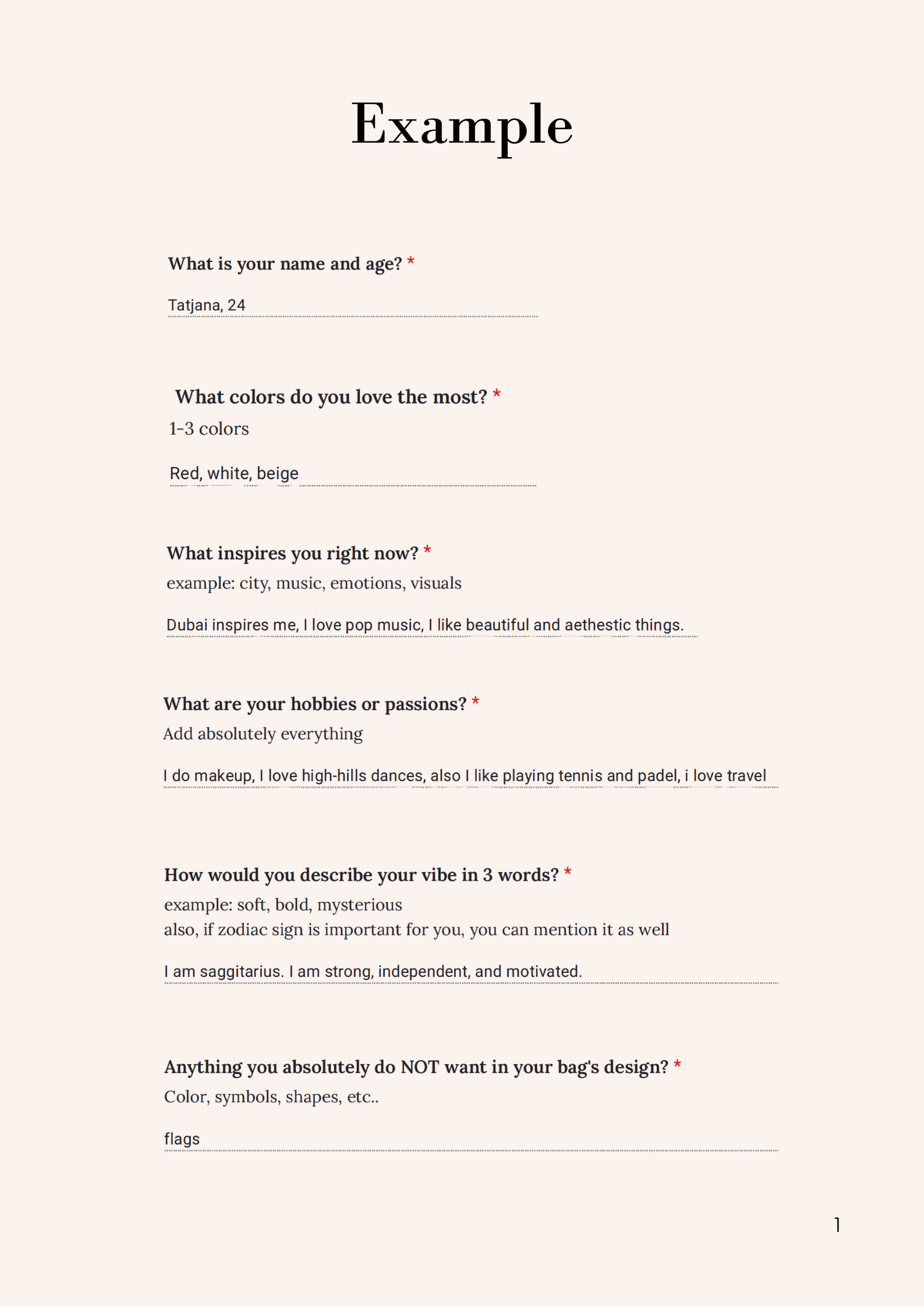 After placing your order, you’ll receive a short questionnaire where you can tell us about yourself: